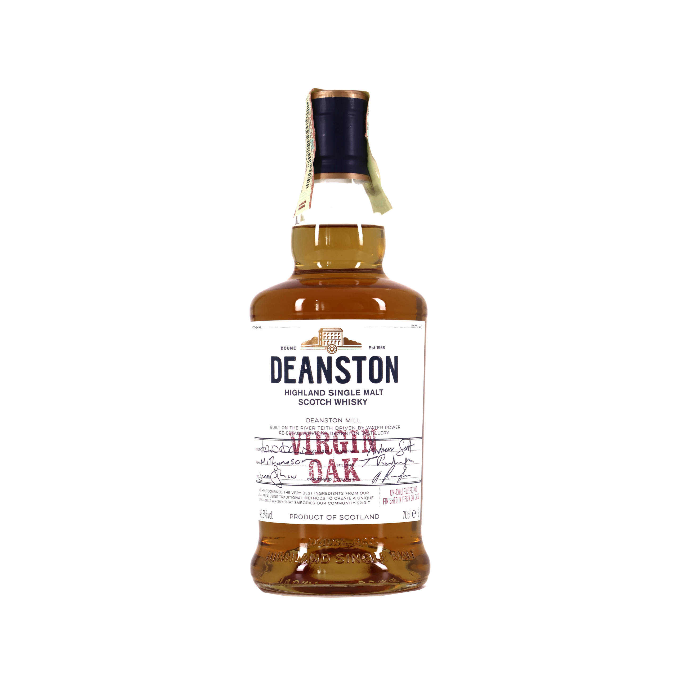 Deanston Virgin Oak este un whisky scoțian single malt. A fost inițial maturat în butoaie de bourbon și și-a finalizat învechirea în butoaie din stejar din Kentucky. Post-gustul lasă nuanțe ușoare de condimente, note plăcute de miere, malț și lemn dulce de stejar.